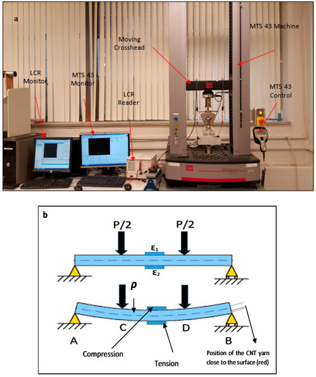 The experimental setup allows pure bending in the central section of the simply supported rectangular polymeric beam with supports at points A and B (Figure 3b). A 30 kN-load cell of the loading machine is used to apply a load, , at points C and D, which are spaced equidistantly from the end and the center of the beam. Two strain gauges are bonded at the center of the top and bottom surfaces of the beam. The strain gauge at the top measures compressive strain, ε1, from bending and conversely; the strain gauge at the bottom measures the tensile strain, ε2. Thus, pure bending occurs between the loading application points, C to D, where there is a constant bending moment of with a radius of curvature ρ. A relation between M and ρ can be used to compute the stress and strain and compare the latter to the values measured from the strain gauges. Since the CNT yarn is embedded on one side alone, close to the surface, it can be assumed that the strain measured by the strain gauge is the one experienced by the CNT yarn. Polymers are homogeneous materials, and thus the strains on the top and bottom surfaces should be identical. However, the side of the polymeric beam with the CNT yarn may experience higher strains due to cracks and cavities created by its integration.