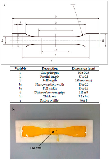 To measure the effect of lateral constraint, additional tests using ASTM D638 specification for the determination of the tensile properties of unreinforced and reinforced plastics in the form of standard dumbbell-shaped test samples were employed. The CNT yarn was embedded in the middle at about half the thickness of a 3.5 mm-thick sample. The same mix ratio used for the polymeric beam was applied to the sample. The sample was cured for 2 h and post-cured for an additional hour. The dimensions of the sample are presented in Figure 4.