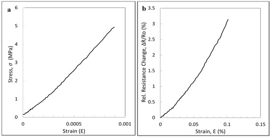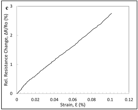 The cured sample with the integrated CNT yarn has an elastic modulus of about 3.3 GPa in the linear region (Figure 5a). Figure 5b shows the piezoresistive response of a sample under tension. At 0.1%-strain, a gauge factor of approximately 29.3 was obtained. This is a conformation of the expected response but also incredibly high for a low strain level and much higher than the gauge factors of metallic foil strain gauges. The gauge factors obtained for the unconstrained CNT yarn of the same batch of CNT yarn were lower than 1. This also validates the postulated effect of slippage and fiber disintegration of the free CNT yarns under tension. The relative resistance–strain curve of three other samples tested exhibit a gauge factor in the range of 23 to 30 with an average value of about 26 (Figure 5c).