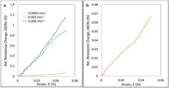 Relative resistance change–strain curves of samples under tension at various strain rates: (a) 0.0005, 0.003 and 0.006 min−1; (b) 0.0005 min−1.