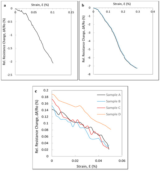 Relative resistance change–strain of constrained CNT yarn samples under compression: (a) 0.1%-maximum strain; (b) 0.3%-maximum-strain; (c) 0.05%-maximum strain (four samples—A, B, C, D).