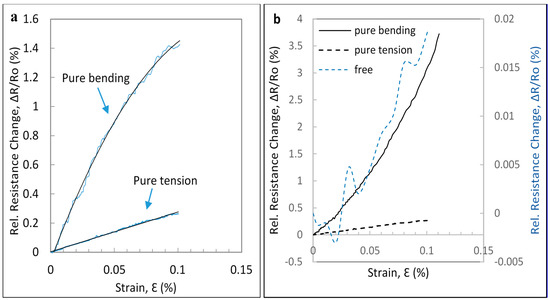 Effect of lateral constraint on the piezoresistive response of free and constrained CNT yarns. Relative resistance change–strain curves: (a) 0.1%-maximum strain (0.003 min−1); (b) 0.1%-maximum strain (0.006 min−1).
