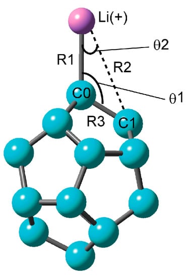 The structures of C20 and C20–Li+ were fully optimized at the CAM-B3LYP level. The structure obtained is illustrated Figure 1. The only stable structure of C20–Li+ was the on-top structure with a Li+ ion on C0. In the pentagonal structure where a Li+ ion is on the carbon five-membered ring, there was a vibration mode of the imaginary part. Thus, it was not a stationary point in this system. The distance R1 between C0 and Li of the on-top structure was 2.055 Å, and the angle θ1 of <C1–C0–Li was 121 degrees (Table 1). The Li–C0 stretching mode (νC0–Li+) was calculated to be 399 cm−1. In our previous research, the hexagonal structure and pentagonal structure were more stable than the on-top structure in C60–Li+ [16]. In addition, it is known that the Li+ ion on graphene has a hexagonal structure. The on-top structure is a structure unique to C20–Li+, which seems to be related to the curvature of C20.