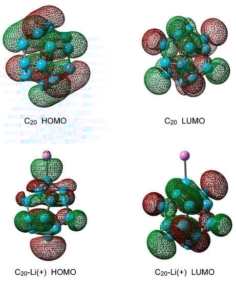Molecular orbitals of C20 and C20–Li+ calculated at the CAM-B3LYP/6-311+G(d) level.
