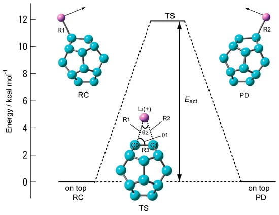 Figure 3 shows the structure of the transition state of C20–Li+ and its energy diagram. The structure of the transition state was found to be a triangular structure with the Li+ ion on the C–C bond (Table 2). Intrinsic reaction coordinate (IRC) analysis was performed, and it was confirmed that the Li+ ion migrated from C0 (RC, reactant) onto the adjacent carbon (C1) (PD, product) via the triangular structure as the transition state. Its activation energy (Eact) is as high as about 12 kcal·mol-1. The structure of the transition state in which the Li+ ion diffuses onto C60 is also a triangular structure. However, its activation energy is less than 4 kcal·mol−1. In other words, the movement of the Li+ ion on the surface of C20 is like a bond alternation. It cannot be said that the Li+ ion diffuses by heat.