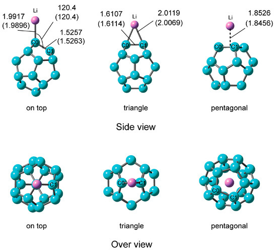 Optimized structures of C20–Li system; on top, triangular, and pentagonal structures calculated at the CAM-B3LYP/6-311+G(d). In parentheses, values were calculated at the CAM-B3LYP/6-311G(d) level. The bond distances and angles are in Å and in degrees, respectively.