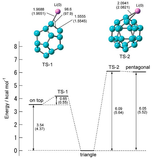 Energy diagram and structures of the transition state of C20–Li system calculated at the CAM-B3LYP/6-311+G(d) level. In parentheses are the values calculated at the CAM-B3LYP/6-311G(d) level.