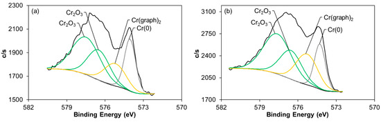 The XPS chromium 2p3/2 signals for chromium-functionalized annealed graphene (a) before sputtering and (b) after argon ion sputtering for 1 min. Cr2O3 is fit with two curves to account for its complex multiplet splitting [11].