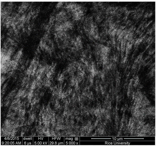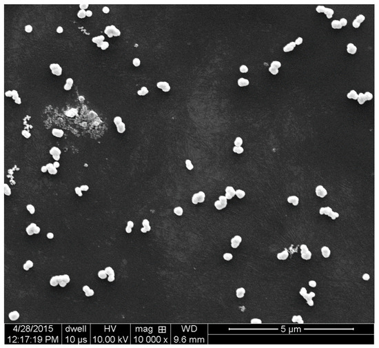 After annealing the SWCNT-coated wafers (600 °C) used to remove any oxygen-containing functional groups (see above), a concentrated (14 mg/mL) solution of W(CO)6 was drop-coated on the wafer and allowed to dry. This was then loaded into a 600 °C argon-purged tube furnace to decompose the W(CO)6 [38]. Upon removal from the furnace, the SWCNT-coated wafer had a gray film covering much of its surface and seemingly uncoated regions that appeared purple to the naked eye. Inspection by SEM showed the gray regions to have a densely packed layer of WO3 particles (330 nm) due to excess reagent, which precluded the analysis of the SWCNTs below. In contrast, SEM of the “purple” region showed a sparser coverage of particles (Figure 9). The presence of the particles was undoubtedly a consequence of the excess of W(CO)6 being deposited on the wafers.