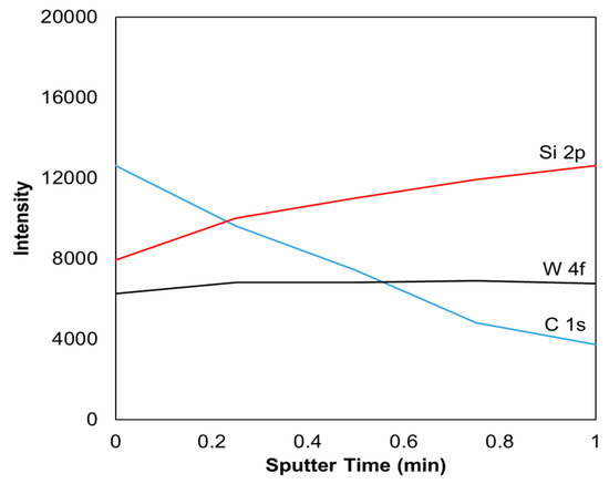 The XPS depth profile of a W(CO)6 functionalized SWNT-coated wafer. The sample was sputtered for 15 s between data collections. The MultiPak software uses the most intense region of the spectra, along with a correction factor, to calculate the intensity of the elements in the depth profile: W = 31.6 eV, Si = 103.3–104.1 eV (varying due to the decrease in SiO2 with depth), and C = 284.4 eV.