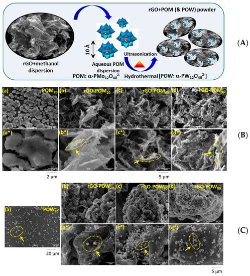 (A) Schematic illustration of hydrothermal synthesis for graphene-based “hybrids” with POM clusters and POW nanodots. SEM images of: (B) rGO-POMx (a–d*); and (C) rGO-POWx (a,b–d*) hybrid series (x = 5, 10, 20, 40, 50, 60 and 80 wt %) revealing surface morphology and microstructure. (Scale bars are shown at the bottom of images).