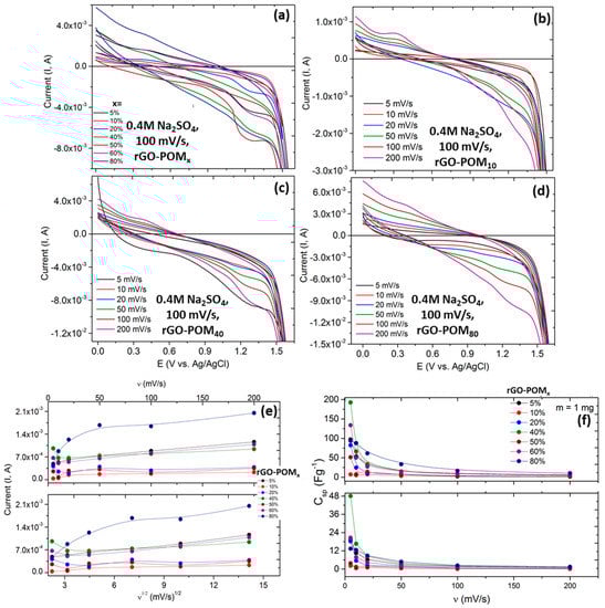 (a–d) Cyclic voltammery (CV) curves measured in 0.4 M Na2SO4 showing pseudocapacitive behavior with x (10, 40 and 80 wt %) and scan rate (v = 5, 10, 20, 50, 100 and 200 mV/s); (e) current versus square root scan rate showing quasi-linear behavior; and (f) gravimetric specific capacitance (Csp; F·g−1) with scan rate for rGO–POMx-based hybrid series (x = 5, 10, 20, 40, 50, 60 and 80 wt %).