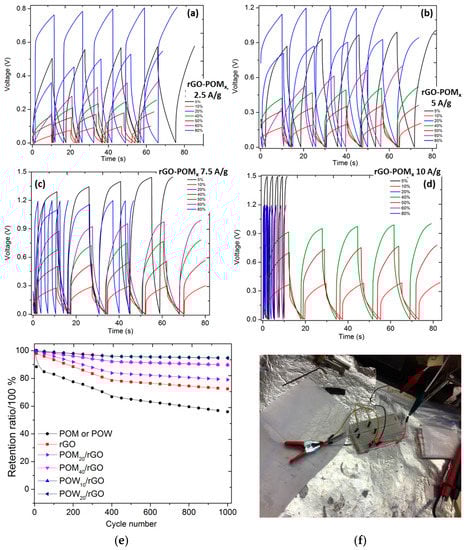 (a–d) Galvanostatic charge–discharge (V–t) profiles for rGO–POMx series at 2.5, 5, 7.5 and 10 A·g−1 current densities; (e) plots of cycle life tests; and (f) an LED indicator powered by representative electrode (rGO–POM40) as symmetric coin cell with 1 M Na2SO4 electrolyte.