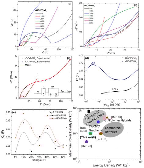 (a,b) Nyquist plots revealing capacitive behavior for grapheme-based hybrids at V = +0.3 V; (c) low frequency capacitance (Clf; F); (d) representative Nyquist plots modeling for rGO–POM40 (and rGO-POW40); (e) C′ (ω) versus log of frequency behavior; and (f) the electrode performance i.e., Ragone plot for AC, CNT/graphene, commercial supercapacitors and batteries, graphene–polymer hybrids and graphene–polyoxometalates electrodes (this work). The inset (panel c) shows equivalent circuit used to fit the impedance data.