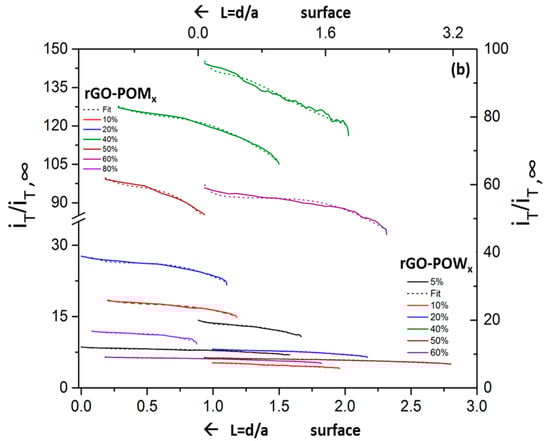 When active graphene domains including basal plane and edge sites are combined with other nanomaterials forming hybrids, they are anticipated to show higher diffusion (D) and electron transfer kinetic rate (kET) depending upon the constituents’ interactions at electrode/electrolyte interfaces. Moreover, they not only enhance electroactivity, but also molecularly bridge HPA nanodots and create tailored interfaces, thus facilitating facile electron transport. Therefore, maximizing electroactive sites on graphene-based hybrids is an active area of research, albeit challenging []. Thus, it becomes pertinent that we investigate the global complex physicochemical processes by probing electrochemical signatures and electron transport locally using scanning electrochemical microscopy (SECM) and hopefully correlate with microstructure, as opposed to scanning probe microscopy technique []. By detecting redox reactions in close proximity to electrode surface, SECM probe approach mode is used to obtain quantitative information of local heterogeneous reaction rates. Figure 5 provides probe approach curves for hydrothermally synthesized hybrids showing normalized tip electrode current versus normalized distance (L = d/a), where d is substrate (electrode)-tip distance and a is the radius of the tip and corresponding fits. The tip current (iT) reaches plateau behavior with steady-state current following: