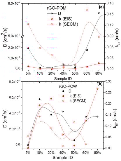 Variation of diffusion coefficient (D) and heterogeneous electron transfer rate constant (kET) derived from EIS data modeling and SECM for: (a) rGO–POMx; and (b) rGO–POWx graphene-based hybrid series.