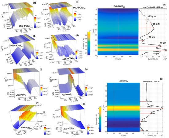 (Color online). Representative scanning electrochemical microscopy images in 400 μm × 400 μm area for: (a–d) rGO–POMx, x = 5, 10, 50 and 60 wt %; and (f–i) rGO–POWx, x = 5, 10, 20 and 50 wt % samples, displaying tip current distribution in two- and three-dimensional contour heat maps with occasional higher (peak)/lower (valley or almost flat) current behavior. Line profiles for: (e) rGO–POM10; and (j) rGO–POW5 samples displaying tip current distribution. A color bar is shown for quantitative values of the tip current.