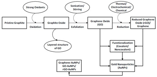 Although Chemical Vapor Deposition (CVD) is a standard method for large scale production of graphene, the solution methods are mostly followed for the preparation of graphene–metal nano-composites. The most convenient technique for synthesizing graphene–metal nano-composites is the use of graphene oxide (GO) or reduced graphene oxide (rGO) and metal nano-particles in the solution phase. Figure 1 schematically presents various steps to prepare graphene–gold nano-composites (Gr–AuNPs) in the solution phase.