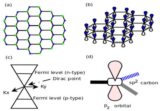 (a)Two-dimensional (2D) graphene layer (b) 2D graphene layer with pz orbital (c) Fermi level shift from Dirac cone after graphene–metal hybrid formation (d) sp2 hybridized carbon atom.