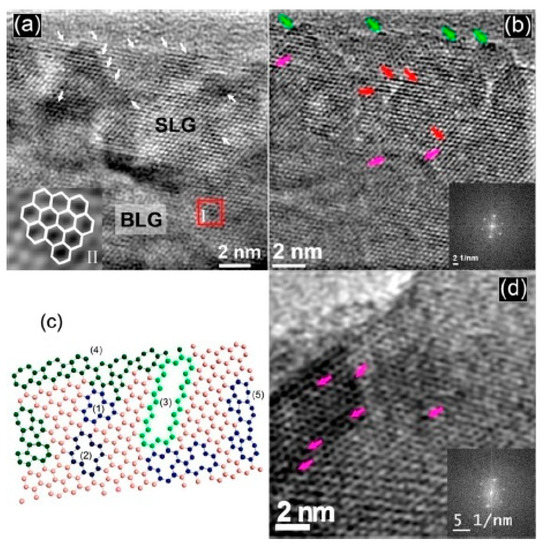 (a) High Resolution Transmission Electron Microscope (HRTEM) image of single-layer (SLG) and bi-layer (BLG). (b) HRTEM image of graphene with the corresponding Selected Area Electron Diffraction (SAED) pattern in the inset; various colored arrows indicate the presence of different kinds of defects (green, edge defects; red, line defects; pink, vacancies). (c) Schematic of the molecular model of a graphene sheet with various defects, such as (1) single vacancy, (2) bi vacancies, (3) line defects, (4) zigzag, and (5) arm chair edge reconstructions highlighted by colored carbon atoms on the basal plane (d) HRTEM image of Graphene gold (GRAu) showing the additional vacancy defects (pink arrows) after Au deposition (Reprinted (adapted) with permission from [23] Copyright © 2014, American Chemical Society).