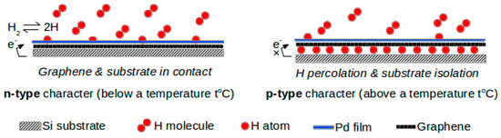 Graphene–noble metal nano-composite is a convenient gas sensor material for detecting hydrogen below its lower explosion limit (LEL). The concept of a dual hydrogen sensing mechanism is presented here. Like other catalytic semiconductor materials, graphene–Pd nano-composite follows the conventional mechanism of hydrogen sensing, by hydrogen adsorption on Pd, followed by dissolution and dissociation of hydrogen molecules to hydrogen atoms. The hydrogen atoms then diffuse to the interface of Pd/graphene where they release electrons to graphene, which shows n-type conductivity, and transfer electrons to the metal electrode. As a result, resistance of the circuit decreases and a higher current is registered in the presence of hydrogen. This is the usual hydrogen sensing mechanism of oxide semiconductors. However, in the case of graphene, there are added intercalation phenomena (Figure 8). Below a certain temperature (the so-called critical temperature), H atoms on the graphene surface in contact with the substrate, release electrons to graphene, making it n-type, i.e., the electron goes to the conduction band of graphene. However, above this critical temperature, hydrogen atoms percolate to the intermediate space between the substrate and the graphene layer, thereby isolating it from the substrate. This may also be called de-intercalation. The electron supply to graphene is discontinued. The conduction band of graphene moves down towards the Dirac cone and the graphene–Pd nano-composite shows p-type conductivity. As a result, the resistivity starts increasing, with the concentration of hydrogen and the current flow through the circuit decreases. This n-/p-inversion in graphene deposited on the substrate has also been supported by Ulrich Lange et al. [37].