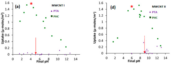 Uptake plots using Pt (II) tetraammine (PTA) and Pt (IV) hexachloride (PHC) for: (a) MWCNT I; (b) MWCNT I Oxd; (c) HB Nanofibers; (d) MWCNT II; (e) MWCNT II OH; and (f) MWCNT II COOH. Asterisks indicate pH of large batch preparation.