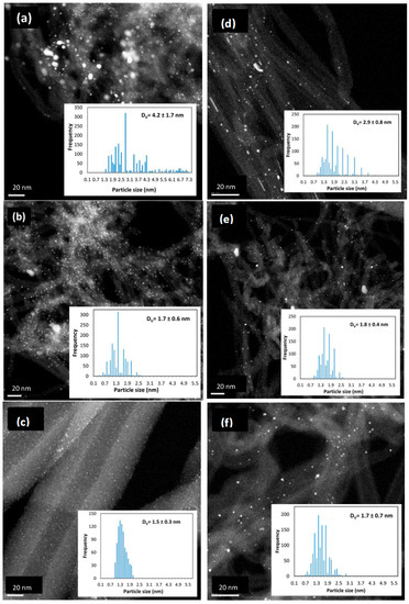 Carbon materials in the form of nanofibers and nanotubes have great potential as catalyst supports owing to their high specific surface area, mechanical strength, and flexibility [1,2,3] and have been increasingly used as such [4]. A survey of Pt nanoparticle synthesis on these newer forms of carbon over the last three years turns up the two dozen papers listed in Table 1. The most common method of preparation involves reductive deposition of soluble Pt precursors using ethylene glycol or sodium borohydride as the reducing agent [5,6,7,8,9,10,11,12,13,14,15,16]. These methods generally produce particles around 3–5 nm in diameter. Colloidal syntheses involving polyol stabilizing agents, with subsequent removal of the ligands and reduction of the metal, are able to synthesize somewhat smaller Pt nanoparticles (1.7–4 nm) [17,18,19,20]. A host of other methods including as simple as incipient wetness and as complicated as radio frequency magnetron sputtering, have also yielded nanoparticles in the range of 2–5 nm [21,22,23,24,25,26,27], with the smallest stemming from electrodeposition (1.5 nm) [26], and atomic layer deposition (2 nm) [22].