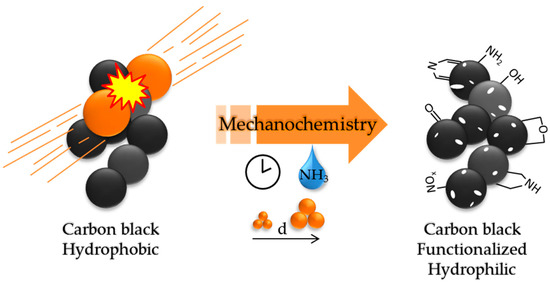 Carbon nanomaterials such as carbon blacks are intrinsically hydrophobic with limited wettability in aqueous media, thus restricting their potential applications. To improve their hydrophilicity, common methods tend to utilize harmful chemicals and conditions, such as a mixture of KMnO4 and H2SO4 or a complex and expensive synthesis setup. In our work, we report a simple method to improve the wettability of these materials by a mechanochemical treatment completed within 1 h at room-temperature utilizing a NH3 solution. Besides increasing the specific surface area of the carbon black from 67 m2·g−1 up to 307 m2·g−1, our process also incorporates nitrogen- and oxygen-containing functional groups into the carbon. This reduces the contact angle from 80° to 30°, confirming an enhanced wettability. Our work presents an easy, fast, and straightforward pathway towards the functionalization of carbon nanomaterials and can be of use in various applications where aqueous wettability is advantageous.