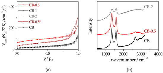 (a) Nitrogen physisorption isotherms of the milled carbon black (CB) under different conditions and (b) Raman spectra normalized to the intensity of the vibration at 1560 cm−1.