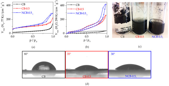 (a) Nitrogen physisorption at 77 K; (b) water adsorption isotherm at 298 K; (c) image of the samples CB, CB-0.5, and NCB-0.51 dispersed in pure water; and (d) contact angle measurement of the different CB samples.