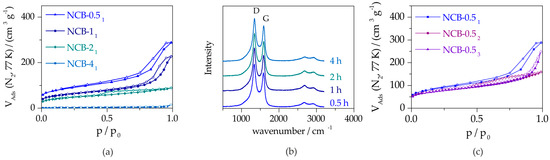 As NCB-0.51 has the highest surface area and nitrogen content, the influence of two selected milling parameters on these properties were examined in particular. The two varied milling parameters, namely the milling time and the volume of added NH3, influence the overall energy input into the carbon material during the mechanochemical treatment [41]. Nitrogen physisorption experiments show that the extension of the milling time also leads to a reduction of the specific surface area (Figure 4a). This can be attributed to the destruction of previously formed mesopores during the treatment, what clearly follows the findings of the milling without NH3 solution (see Section 2.1). It can be assumed that prolonging the milling time is disadvantageous to the porosity and does not increase the nitrogen content significantly.