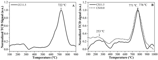 Only the carbon deposition over the CC11.5, CS11.5, and CT10.0 catalysts, which exhibited the highest content of carbon, were analyzed since the other catalysts did not show good Raman spectra Figure 9A shows the G and D bands. Notably, the carbon deposition over the CC11.5 catalyst showed a lower D band intensity and higher G band intensity; therefore, it presented the highest structural order among the other catalysts. In contrast, we found that catalyst CS10.0 also showed an intense D band, even though it showed a prominent G band. Then, the SWCNT produced with this catalyst exhibited larger structural disorder. It has been proven that the presence of sodium in Co-MCM-41 destroys its selectivity toward SWCNT deposition [25]. Finally, the CT11.5 catalyst also showed a prominent G band; however, there was a significant loss in the structural order as well. An examination of the radial breathing mode (RBM) zone, in Figure 9B, allows us to confirm the presence of SWCNT. The signals of the CC11.5 catalyst range from 175 cm−1 to 275 cm−1, while the other catalysts show distributions below 150 cm−1. The lower energy vibrations in the RBM zone are related to large-diameter SWCNT, even double-wall carbon nanotubes. Thus, CC11.5 has the highest activity and the narrowest diameter distribution.