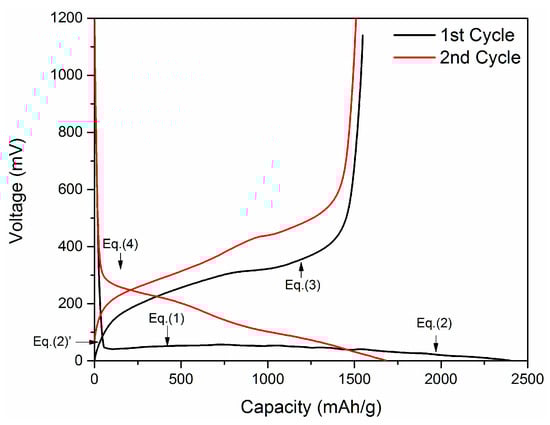 Typical charging/discharging curves for first two cycles of Si anode are presented in Figure 2. There are four plateaus labeled as Equations (1)–(4) corresponding to the following reactions [27]: