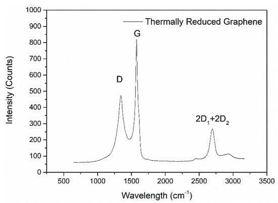 Raman spectrum was efficient to provide additional information about the quality of the synthesized graphene nanosheet/nanosheets [95,96,97]. It had been well established that graphite and graphene have characteristic peaks at 1340 cm−1, 1584 cm−1 and 2700 cm−1 as shown in Figure 3. The peak at 1340 cm−1 was characterized as D band. The peak at 1584 cm−1 was called G band, which was caused by E2g vibration mode that represented the C=C bond stretching of all pairs of sp2 atoms. The peak at 2700 cm−1 was characterized as G′ (2D) band, which was caused by the double resonance process. The positions of both G and G′ bands could determine the number of layers of graphene nanosheets. For a single graphene, the peak position would have 5 cm−1 upshifting with constant intensity. The G′ band was also named 2D band because the G′ peak would follow the movement of D peak with a correlated number of layers of graphene nanosheets. There were actually two individual peaks identified within the 2D band, which were 2D1 and 2D2 in graphite, but only 2D1 could be observed in single layer graphene. The intensity of 2D2 peak increased with the increasing number of graphene layers. The 2D peak eventually grew into the typical graphite characteristic peaks when there were more than five layers of graphene nanosheets stacked together [96,98]. The Raman spectrum could also provide information about the size of graphene flakes and defect density by calculating the intensity ratio of D band and G band (ID/IG), where ID and IG represented the integrated intensities [99,100].