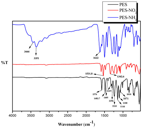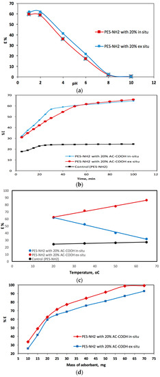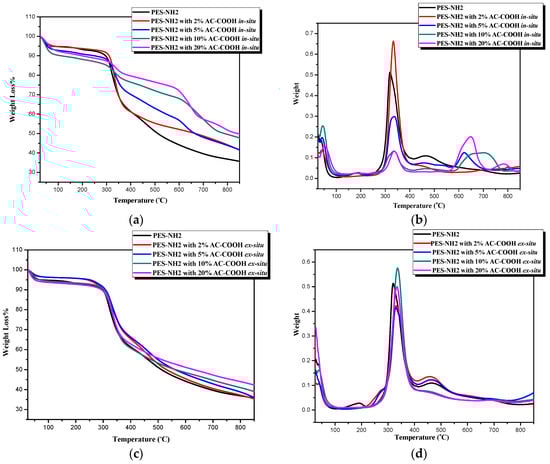 Figure 5c,d, improved the thermal stability in a way less than in the in situ method, but with a higher thermal stability in comparison to with the control. This came in agreement with the XRD data, which showed a slight change in the chemical structures between the control and the PES–NH