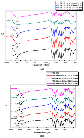 Figure 3a, it can be clearly seen that as the concentrations of AC–COOH increased, the shifting of the amine stretching peaks was noticed, which suggests that the interactions between AC–COOH and PES–NH
