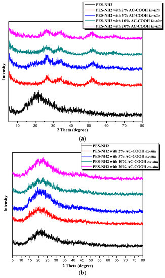 2 with AC–OOH at 2θ = 33° and 52°, which referred to the presence of AC–COOH and their interactions with PES–NH