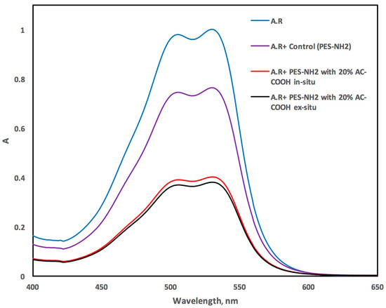 The ΔS positive values indicate there is an increase in the freedom degree at the solid-liquid system during the acid red binding, and this is because of the presence of water molecules that are released by hydration spheres occurred during the adsorption mechanism. On the other hand, the ΔS negative values indicate that the entropy (reorientation phase) is governed at the activation state and nonelectrostatics interactions between the analyte (acid red dye) and the adsorbed material (PES–NH2–AC–COOH). In addition, the ΔG negative values at a temperature of 293 K for both PES–NH2 with in situ 20% AC–COOH and PES–NH2 ex situ with 20% AC–COOH indicate that the interactions that form during the adsorption of acid red retention on PES–NH2 with AC–COOH solid phase were spontaneous. In contrast, the positive value of ΔG at 293 K for the control (PES–NH2) indicates that interactions that form during the adsorption of acid red retention on PES–NH2 solid phase were nonspontaneous.