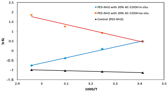 Kc versus 1000/T plot was applied for the retention of acid red dye onto the solid phase of PES–NH
