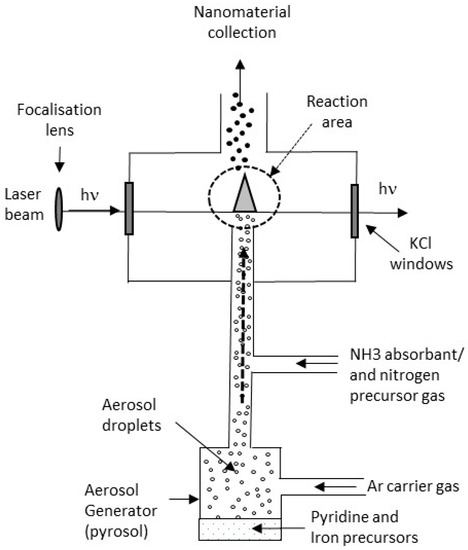 Iron III oxide–hydroxyde (FeOOH) elongated nanoparticles suspension in ethanol 20 wt %, iron III acetylacetonate (Fe(C5H7O2)3 referred as Fe(acac)3) and pyridine were purchased from Aldrich (St. Louis, MO, USA), and used as received. The CO2 laser (λ = 10.6324 µm) was a 2200 W PRC, SL 2200 from PRC (Landing, NJ, USA). It was used in continuous mode and the laser beam was focused on a horizontal plane by way of a hemispherical ZnSe lens. The first Liquid Precursor Mixture (referred as LPM-1) involved here is prepared by mixing the commercial FeOOH nanoparticles suspension in ethanol with pyridine. The volume ratio pyridine/ethanol is 50/50 giving a final FeOOH concentration of 25 g·L−1. The second Liquid Precursor Mixture (referred as LPM-2) is an iron III acetylacetonate solution at 14 g·L−1 in pyridine. The liquid precursor media were nebulized using a pyrosol® 7901 type piezoelectric aerosol generator from RBI (Meylan, France).