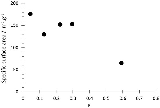 Trend for the specific surface area of the powders as a function of R parameter for materials obtained from LPM-2.