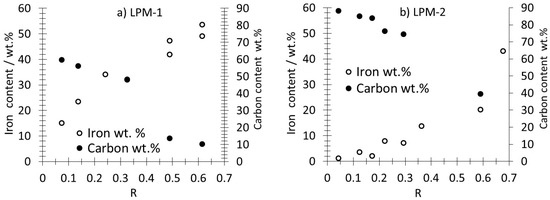 Carbon and iron contents as a function of R for nanomaterials prepared using (a) FeOOH (LPM-1) and (b) iron III acetylacetonate (LPM-2). Empty and filled symbols correspond to iron and carbon contents, respectively.