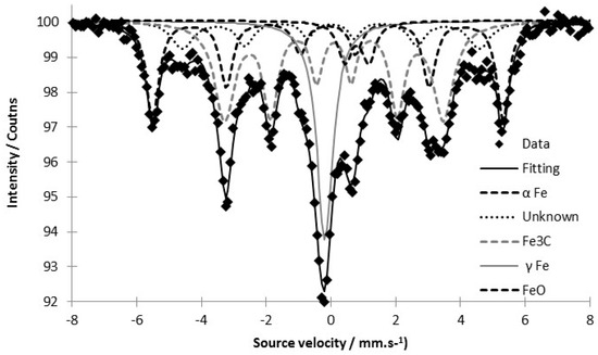 As explained above, all the nanomaterials contain iron and the question about the nature of the formed iron phases raised. Taking into account the elements involved in the synthesis (Fe, C, N, O), the number of possible iron phases is very high: pure metal iron, iron carbides, iron oxides, iron nitrides, carbo-oxynitrides. The task is even more complicated since several phases show different stoichiometry and non-stoichiometric ones are numerous, in particular for iron nitrides. Mossbauer spectroscopy and XRD measurements were performed in an attempt to get insights on these iron phases. This was achieved essentially on powders obtained from FeOOH since they have higher iron content, what favours Mossbauer analysis and contain larger particles what may favour XRD analysis by avoiding too broadly overlapped diffraction peaks. An example of Mossbauer spectra fitting is shown in Figure 6. It was performed with clearly identified phases, namely α Fe, γ Fe, Fe3C and possibly FeO. An additional component was added to refine fitting, which could not be ascribed at this time. Although incomplete, the results obtained here are precious since they allow three iron phases (α Fe, γ Fe, Fe3C) to be identified and suggest the presence of a fourth one (FeO). The relative phase content was estimated on the basis of fitting and showed a variable amount of unknown phase as a function of R parameter (see Appendix A for details on Mossbauer spectroscopy data).