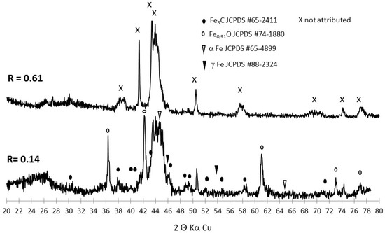 For high values of R (0.61, Figure 3a) the nanomaterial contains large particles which appear bright on the micrograph, with diameters ranging from ≈1 µm to few hundreds of nanometres. The material also contains smaller particles but it was impossible to estimate the ratio between large and small particles populations. Energy Dispersive X-ray analysis (EDX) achieved on large particles showed that they consist of an iron rich phase. It has been known for a long time that iron acts as a catalyst for hydrocarbon decomposition and in graphitization processes [24]. Consistently, the micrograph (Figure 3a) shows that some of the iron based particles are surrounded by a thin layer presumably based on carbon that could be the result of such catalytic effect.
