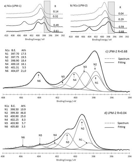 (a,b) N1s core level features as a function of R for (a) LPM-1 and (b) LPM-2. Grey area shows the binding energy region in which nitride iron can be found. Intensities are normalized; (c,d) are tentative peak fitting for LPM-2 at (c) R = 0.68 and (d) R = 0.04. Fitting components are labelled N1 to N6 and relative weights and binding energies are listed in the figures.