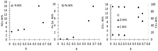 Indeed, elements contents for N1s, Fe2p, C1s and O1s were drawn as a function of R parameter and showed marked trends: N and iron contents increase with R (Figure 9a,b) while carbon and oxygen contents show reverse trend from each other (Figure 9c), that is, oxygen content increases and carbon content decreases with higher R. Data in Figure 9 relate to materials synthesized with Fe(acac)3 (LMP-2) but the observed trends for powders derived from LPM-1 are similar.