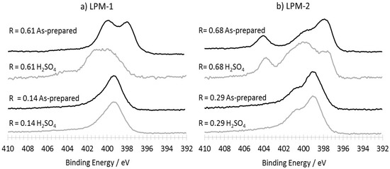 XPS N1s core level spectra for powders obtained from (a) LPM-1 and (b) LPM-2 before and after H2SO4 treatment, for low and high R values. Intensities are normalized.