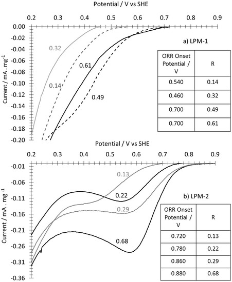 Electrochemical measurements on porous electrodes prepared from LPM-1 derived materials were hard to achieve, presumably because of the high iron content and the presence of large iron based particles. Indeed, immersion in the acid electrolyte resulted in a significant gaseous production what led to a strong degradation of the layer homogeneity and detachment from the carbon felt. Such difficulties were quite rare for electrodes prepared with materials obtained from LPM-2. Nevertheless, cyclic voltammetry was recorded on porous electrodes at 5 mV·s−1 in HCLO4 1 M for materials synthesized with different R values from LPM-1 and LPM-2. Background current correction was performed by subtracting CVs recorded in argon saturated electrolyte from those recorded in oxygen saturated electrolyte. ORR catalyst efficiency was evaluated using the onset potential for the ORR shown by the CVs.