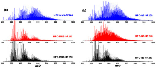 The resulting pitches were also analyzed by element analyses, 13C-NMR (Figure 5), and TOF-MS (Figure 6). 13C-NMR analyses indicated that the fa of obtained pitch increased with increasing SP due to the removal and polymerization of light matters (Table 2). Meanwhile, there is a gradually decreased intensity of peak in the region around 30 to 50 ppm of the 13C-NMR spectra, which indicated that the cross-linking bridges between the aromatic units were further broken during the thin layer evaporation process. TOF-MS results showed that the molecular weight distributions of HPC-MNS and HPC-QS derived pitches were between 250 and 800 m/z, indicating that low molecular weight compounds in the range of 200–500 m/z were successfully removed. Moreover, the Mw of HPC-QS derived pitch was lower than that of HPC-MNS derived pitch at the same SP (Table 2), which suggested that the HPC-QS derived pitch had more homogenous than the HPC-MNS derived pitch. Additionally, Figure 7 shows XRD patterns of HPC-MNS and HPC-QS derived pitches. Whether HPC-MNS derived pitches or HPC-QS derived pitches, their peaks between 20° and 30° increased as increasing their SP, which was in agreement with their higher fa values with higher SP. Hence, these results revealed that pitches with higher SPs contain a higher degree of molecular structure stacking and less amorphous molecular structure.