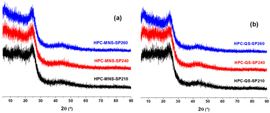 XRD patterns of HPC-MNS (a) and HPC-QS (b) derived pitches.